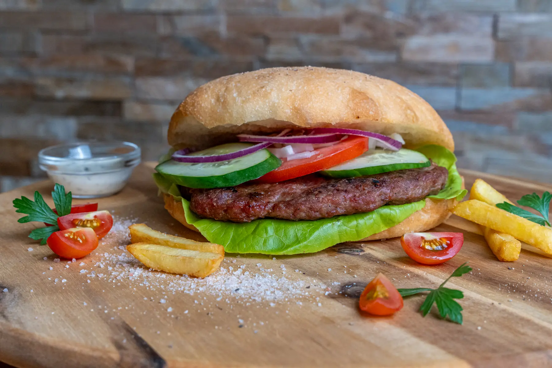 Pljeskavica ist eine unverzichtbare Spezialität der Balkanküche, die auf unserer Grillrestaurant-Speisekarte nicht fehlen durfte.