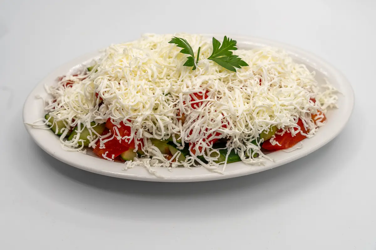 Knackige Tomaten, Gurken und Paprika treffen auf würzigen Schafskäse und fein abgestimmtes Olivenöl – der perfekte frische Salat aus dem Balkan.